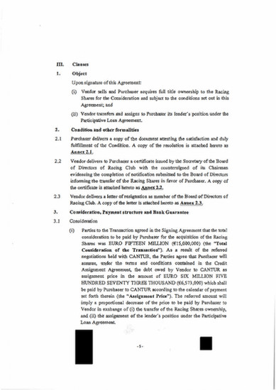 Por otra parte, el contrato de la compra-venta de acciones presenta alguna curiosidad adicional. Para garantizar las obligaciones de pago de Ali Syed para con Dunviro, que comprendían tanto el pago inicial de 1.002.000 € como el pago aplazado de 7.425.000€, Ali asumió el compromiso de entregar a Dunviro un aval bancario irrevocable y a primer requerimiento... Y el documento presentó una contradicción técnica flagrante, fijando el importe de dicha garantía en "EURO THREE MILLION (€1,500,000)", con una evidente discrepancia entre la letra y el número.