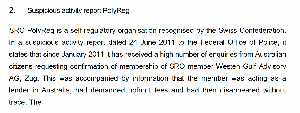 En contraste con estas palabras, esta investigación sostiene con el respaldo de la justicia suiza que, justo unos días antes de esta célebre rueda de prensa y de cerrar la operación, la organización suiza PolyReg ya estaba recibiendo "un número inusualmente alto" de consultas de ciudadanos australianos, que preguntaban por la seriedad de la empresa y se quejaban de que WGA, como prestamista, exigía el pago de comisiones por adelantado y luego desaparecía sin dejar rastro. Así lo transmitieron también en un informe firmado el 24 de junio de 2011 que dirigieron a la Oficina Federal de Policía, que cuatro días más tarde ordenó el bloqueo oficial de las cuentas en Credit Suisse.